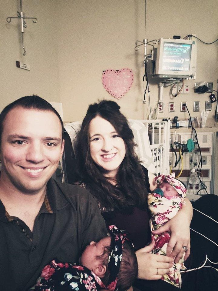 Cooper made it home safely from Kuwait and his first home mission was to go straight to the hospital and surprise his wife who had no idea that he was coming. The babies, Emma and Kyla, were placed in intensive care because they were born prematurely at 33 weeks.