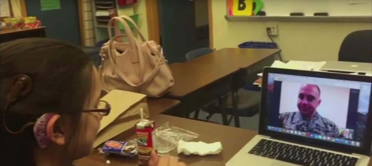 13-year-old Amber couldn’t believe her eyes when her Army dad surprised her by walking through the door during their one of their weekly Skype sessions. Tech Sgt. David Opperman was overseas for many months, the longest he had been gone in his 20 years in the service. Amber’s school made a special arrangement to let her miss part of class every Wednesday to Skype with her father.