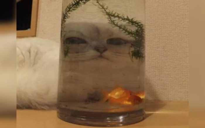 Cats usually have small adorable faces – that’s why we love them so much. They’re just so small and cute – unless they are big Maine Coons of course – then they’re really big! This white kitty loves to stare at his “friends” in the water. They’re just so appealing. Maybe little kitty is just waiting for his chance to push them over the table and dash open his mouth to open and swallow!