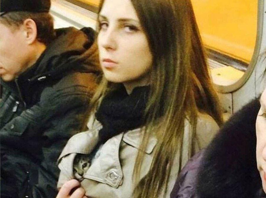 It’s obvious that this woman’s not looking for attention, by the way, she’s hiding the kitty in her coat and glaring at the person taking this photograph. But cats have to breathe, too – which is great news for the other passengers on the train, who were able to get a glimpse of the cute furball. Hopefully, for the woman’s sake, it didn’t get scared during the journey and hang on for dear life with its claws!