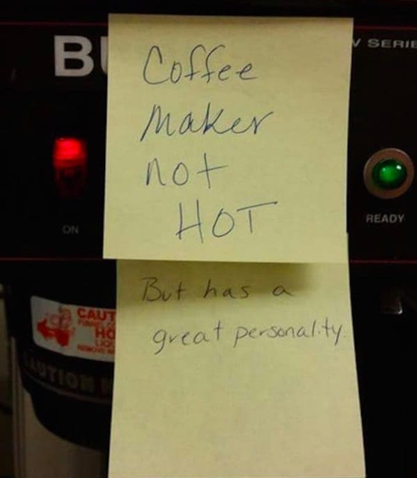 While every office in the world has a coffee maker, not every office has an efficiently-working coffee maker. Sometimes, it doesn’t produce hot coffee. But the boss may not want to buy a new one. So what do you do? You buy your coffee at Starbucks. But at least leave a note for the others not to waste their time. And at least make it funny. Like this one! Love it.