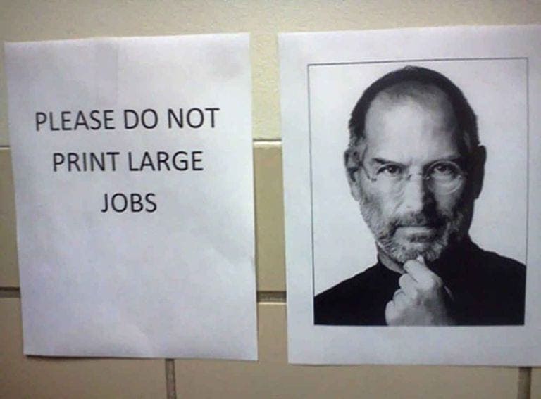 Don’t you just love passive aggressive duels in the office? One person thinks they have all the power, and then someone comes along and drops a joke bomb on them. The guy that posted the page on the left was fed up with the wasted ink that large print jobs take. The obvious response: to print a large photo of Steve Jobs.