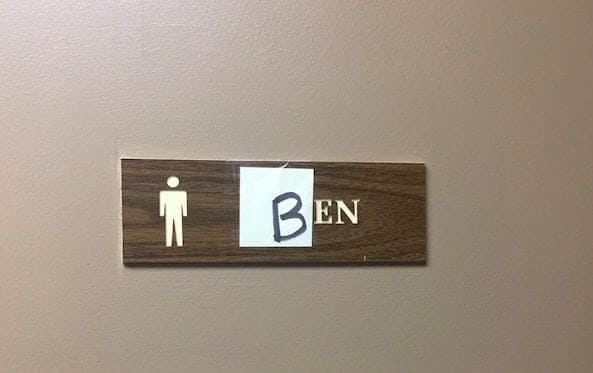 Some washrooms say Ladies and some say Men, but in this office, there are only ladies and Ben. Ben, as the only man in the entire office, gets the whole men’s bathroom to himself. He gets the whole place for himself and doesn’t have to worry about anyone giving him the eye after he leaves the bathroom and smells up the place.